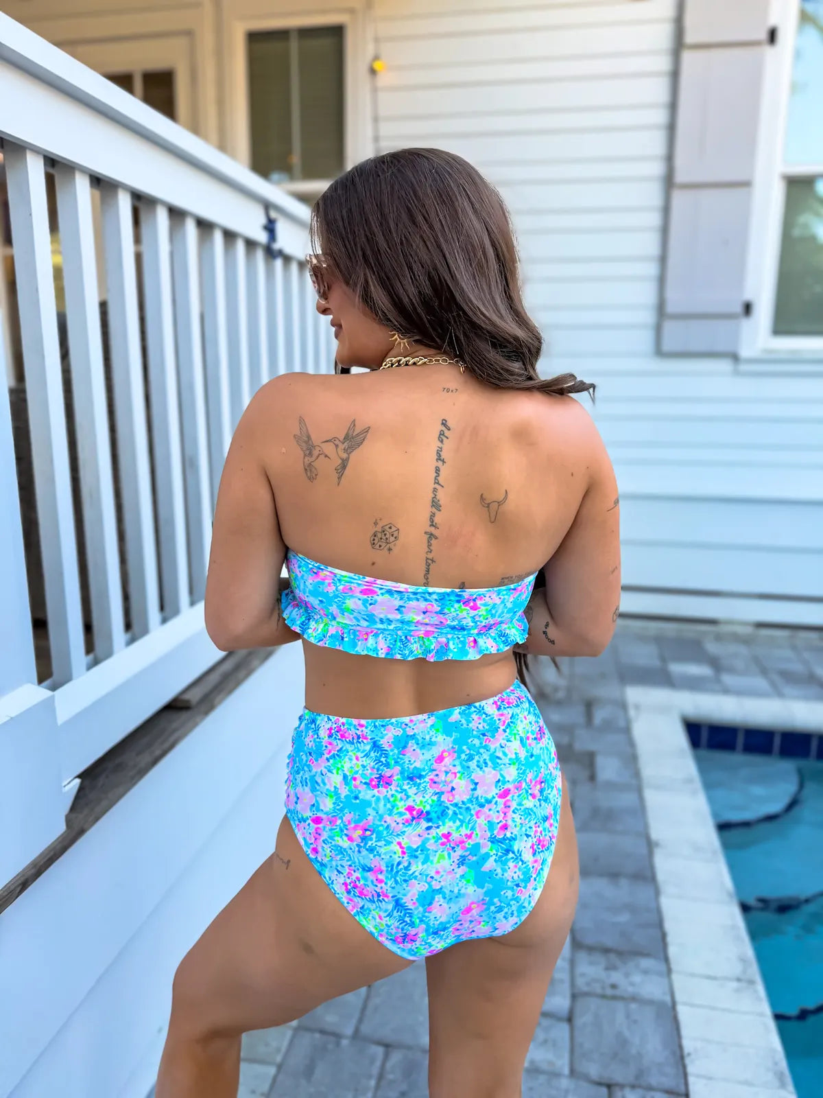 The strapless top features a playful ruffle detail for a feminine touch and includes removable pads so you can customize your level of support and coverage. Paired with high-waisted bottoms, this set provides full coverage and a confidence-boosting silhouette that’s both stylish and secure.